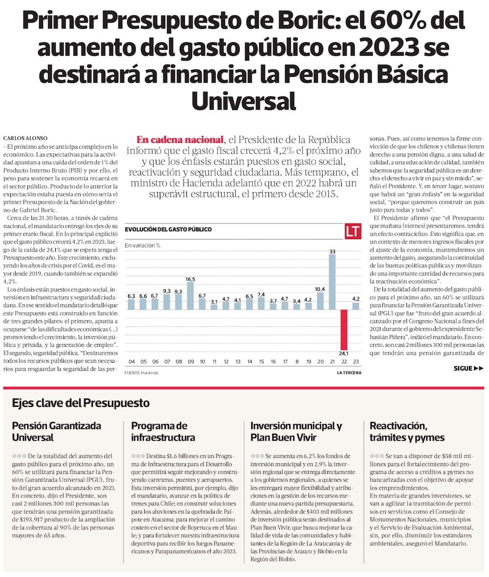 Presupuesto 2023: gasto fiscal crecerá un 4,2% y Presidente Boric promete crear 200 mil empleos con más inversión pública - (Diario Financiero)