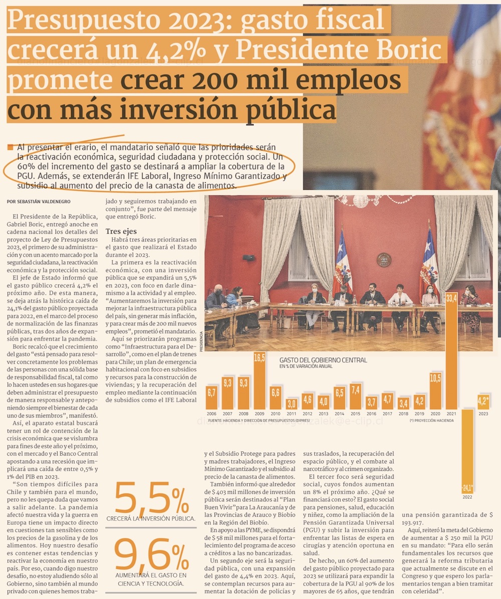 Primer Presupuesto de Boric: el 60% del aumento del gasto público en 2023 se destinará a financiar la Pensión Básica Universal - (Pulso)