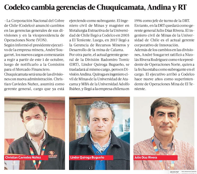 Nombran a nuevos gerentes generales en Chuquicamata y RT - (El Mercurio de Antofagasta)