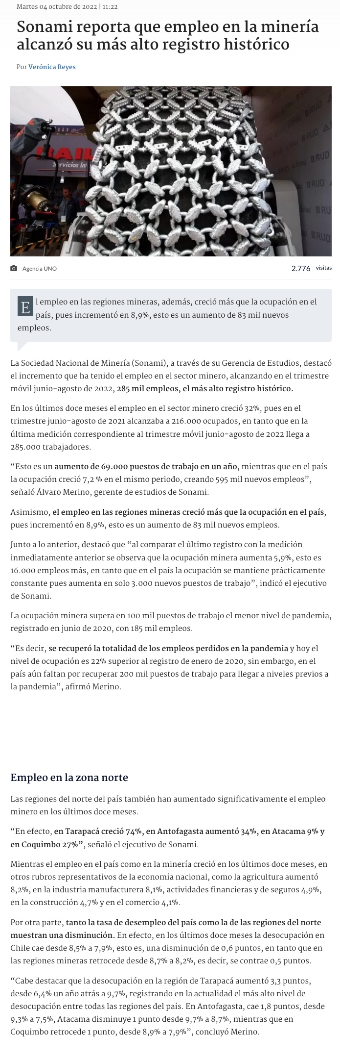 Ocupación minera alcanza máximo nivel histórico - (El Mercurio de Santiago)