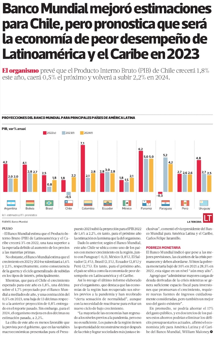 Banco Mundial estima que PIB chileno caería 0,5% en 2023, el menor desempeño de A. Latina - (El Mercurio de Santiago)