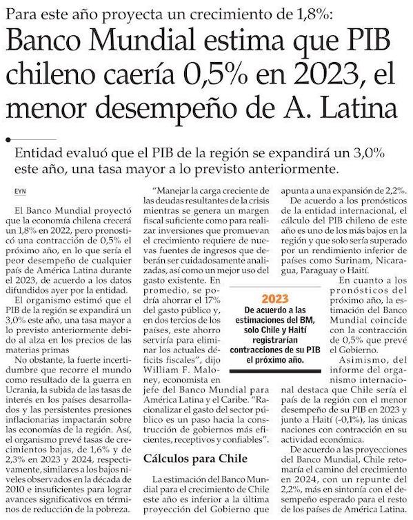 Banco Mundial mejoró estimaciones para Chile, pero pronostica que será la economía de peor desempeño de Latinoamérica y el Caribe en 2023 - (Pulso)