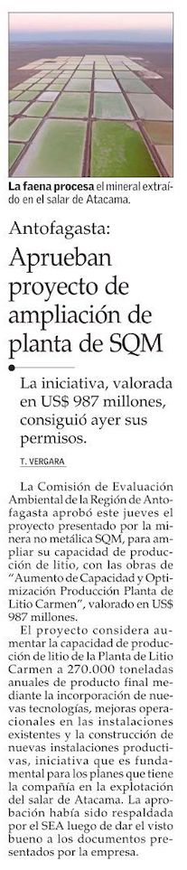 Comisión de Evaluación Ambiental aprueba el proyecto Carmen de SQM por US$987 millones - (El Mercurio de Antofagasta)