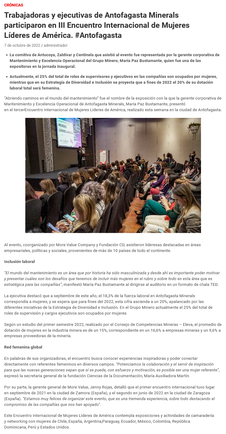Trabajadoras y ejecutivas de Antofagasta Minerals participaron en III Encuentro Internacional de Mujeres Líderes de América - (mvcomunicaciones.cl)