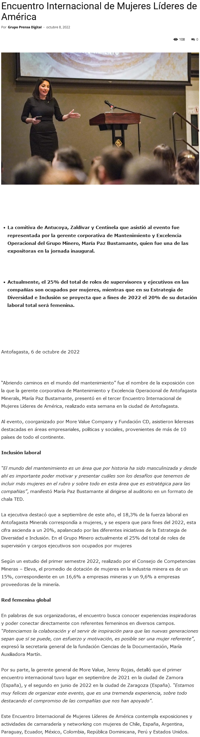 Trabajadoras y ejecutivas de Antofagasta Minerals participaron en III Encuentro Internacional de Mujeres Líderes de América - (mvcomunicaciones.cl)