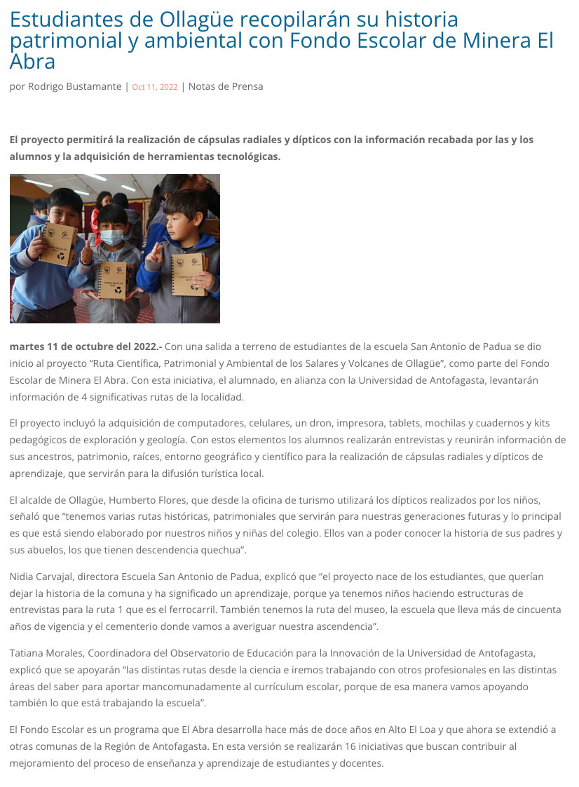 Estudiantes de Ollagüe recopilarán su historia patrimonial y ambiental con Fondo Escolar de Minera El Abra - (antofagastanoticias)