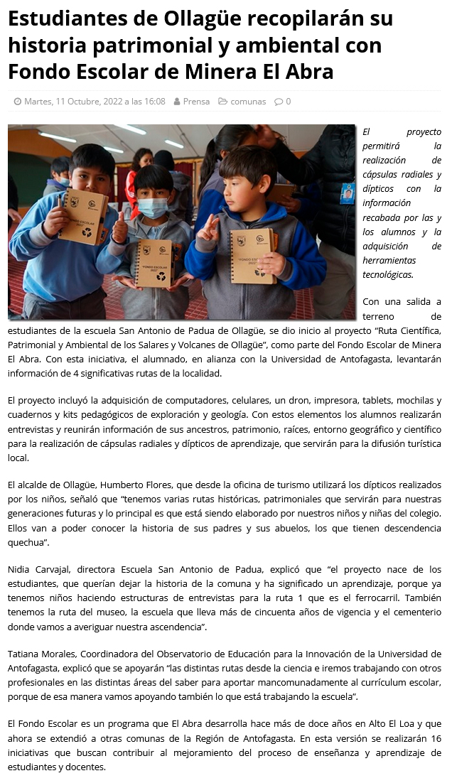 Estudiantes de Ollagüe recopilarán su historia patrimonial y ambiental con Fondo Escolar de Minera El Abra - (portalminero)