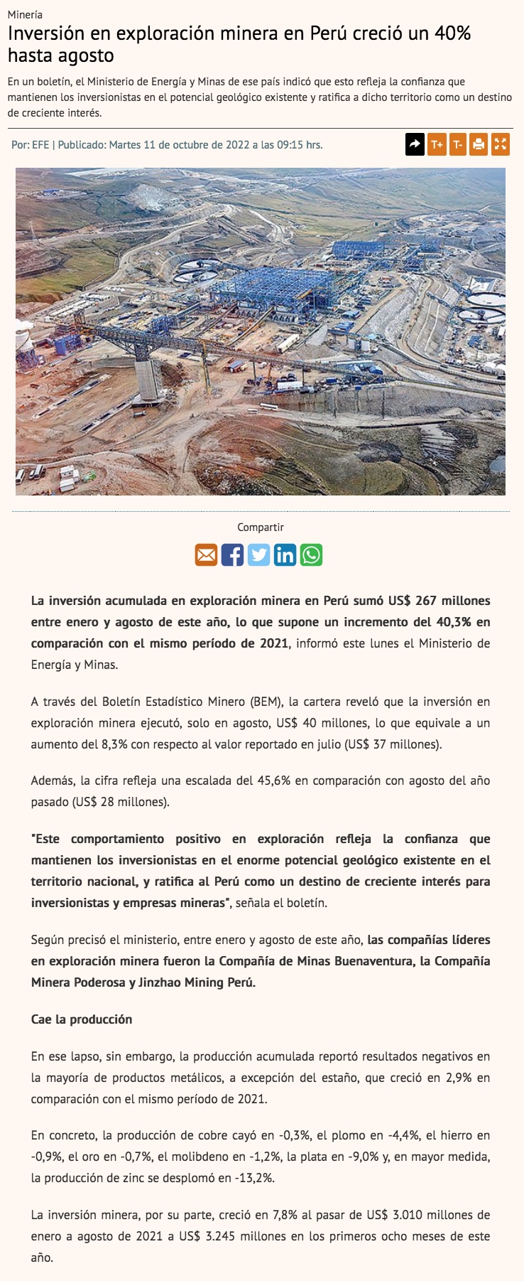 Inversión en exploración minera crece 40% en Perú - (reporteminero)