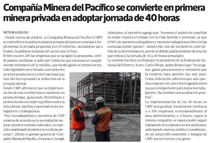 Compañía Minera del Pacífico es la primera empresa privada del sector en implementar la jornada de 40 horas - (Diario Financiero)