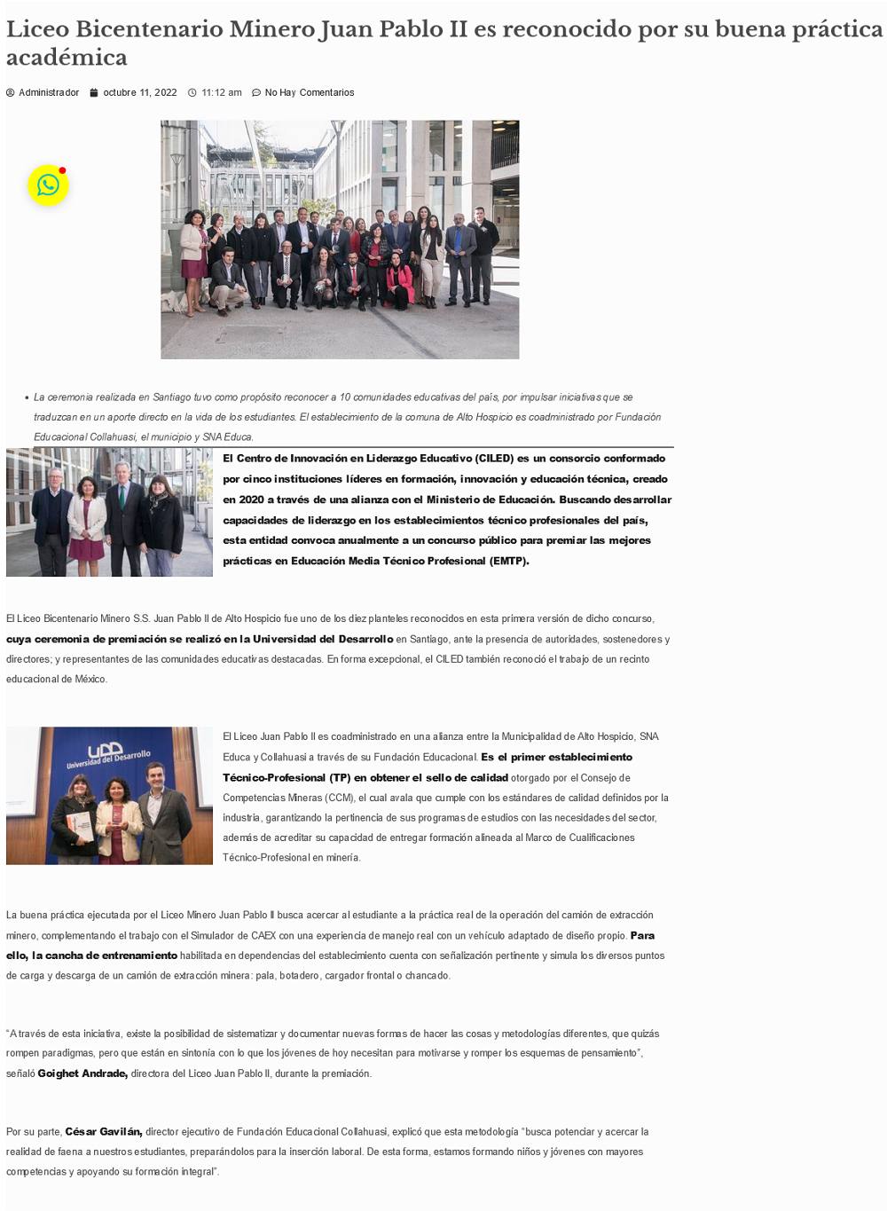 Liceo Bicentenario Minero Juan Pablo II es reconocido por su buena práctica académica - (ceinoticias.cl)
