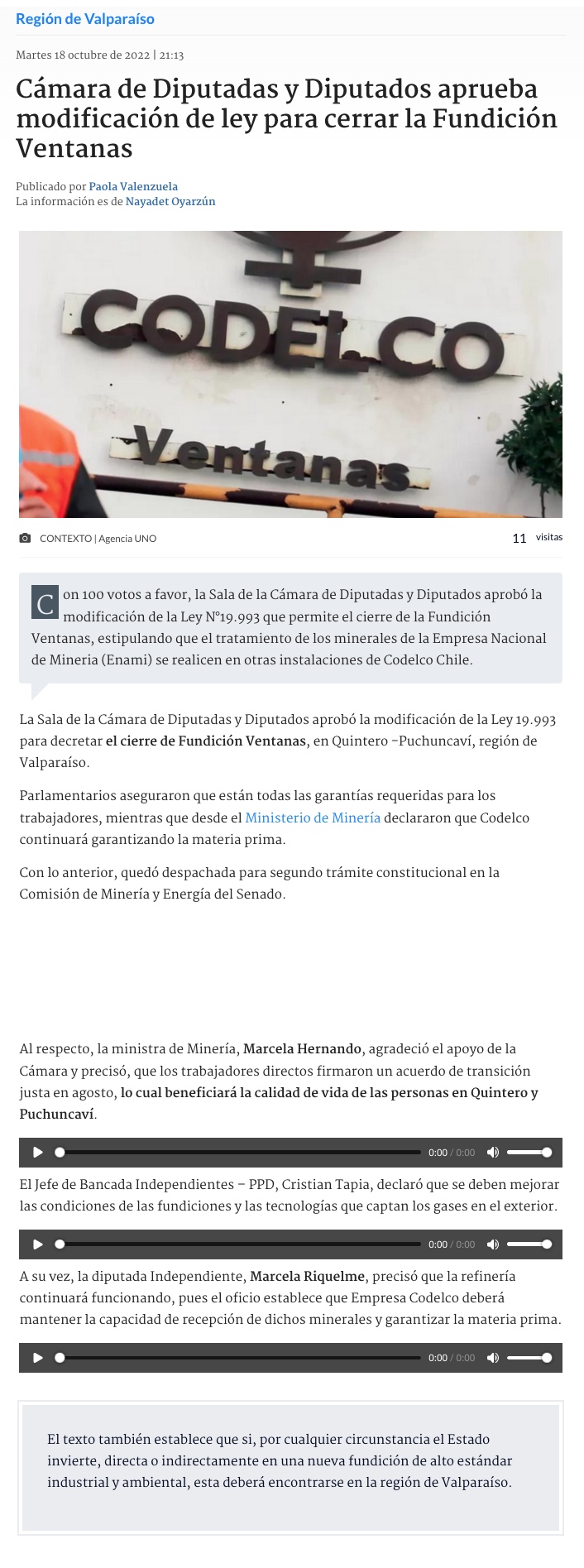 Cámara aprueba proyecto de ley que permite el cese de Fundición Ventanas - (Pulso)