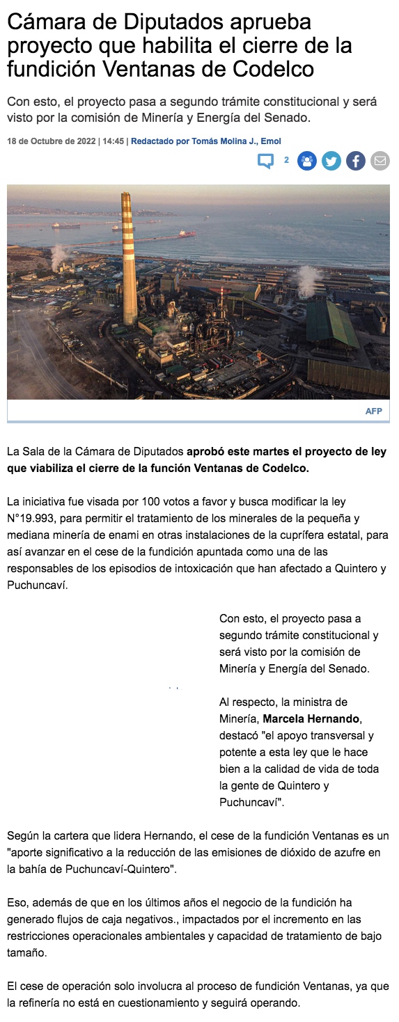 Cámara aprueba proyecto de ley que permite el cese de Fundición Ventanas - (Pulso)