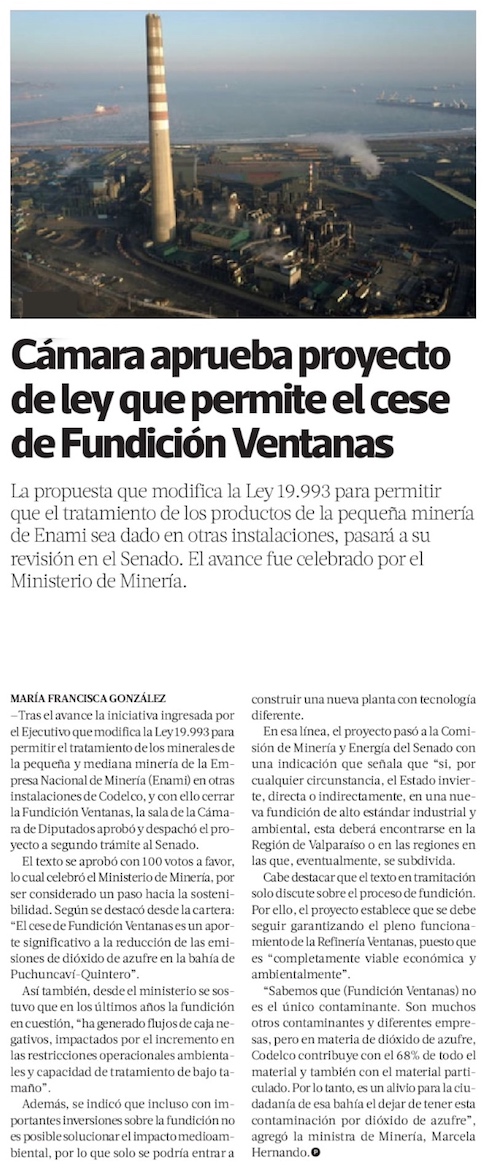 Avanza proyecto que viabiliza el cierre de fundición Ventanas - (El Mercurio de Santiago)