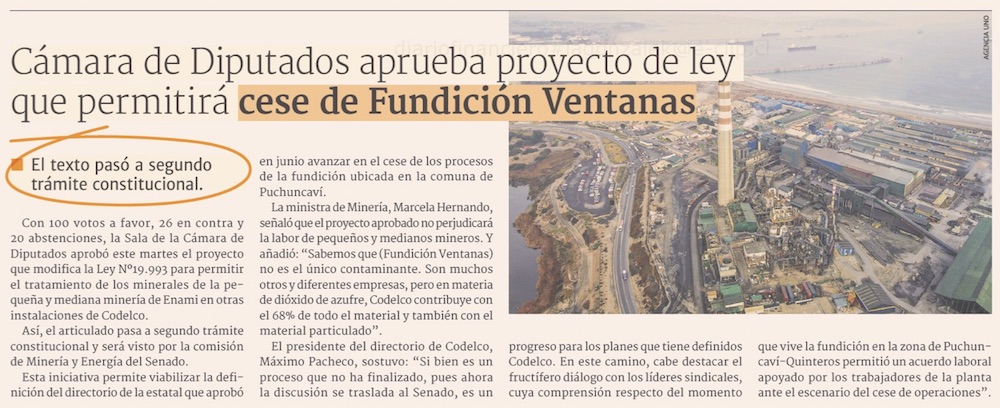 Cámara aprueba proyecto de ley que permite el cese de Fundición Ventanas - (Pulso)
