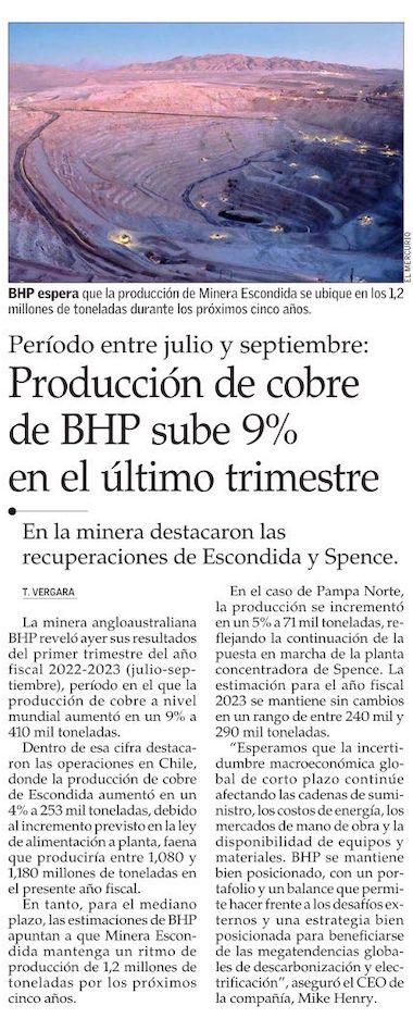 Producción de Escondida sube 4% en el trimestre julio-septiembre - (Pulso)