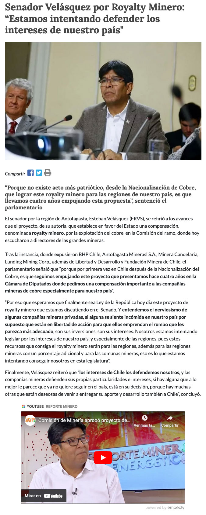 “No existe acto más patriótico, desde la Nacionalización de Cobre”: Senador Velásquez (FRVS) por avances de proyecto de Royalty Minero - (diarioantofagasta)