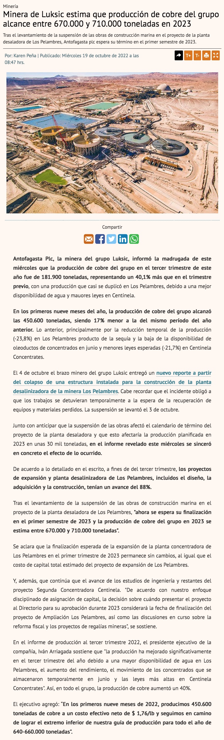 Antofagasta Minerals informa notorio aumento en su producción durante el tercer trimestre 2022 - (mch.cl)