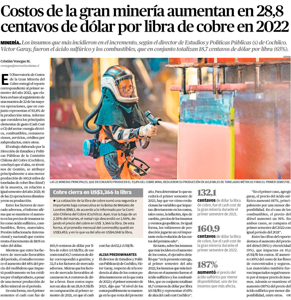 Costos en la Gran Minería del Cobre anotan alza de 21,81% - (El Mercurio de Santiago)
