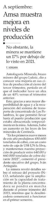 Antofagasta Minerals informa notorio aumento en su producción durante el tercer trimestre 2022 - (mch.cl)