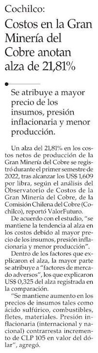 Costos de la gran minería aumentan en 28,8 centavos de dólar la libra de cobre en 2022 - (El Mercurio de Antofagasta)