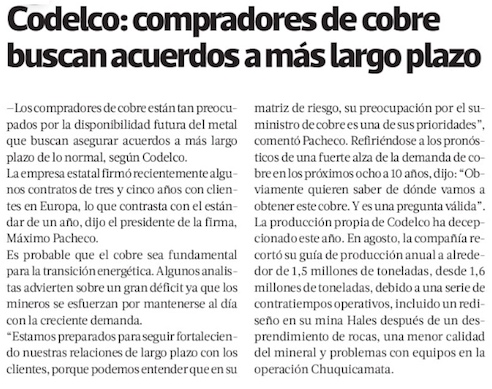 Codelco ve interés de compradores por cobre a largo plazo - (El Mercurio de Santiago)