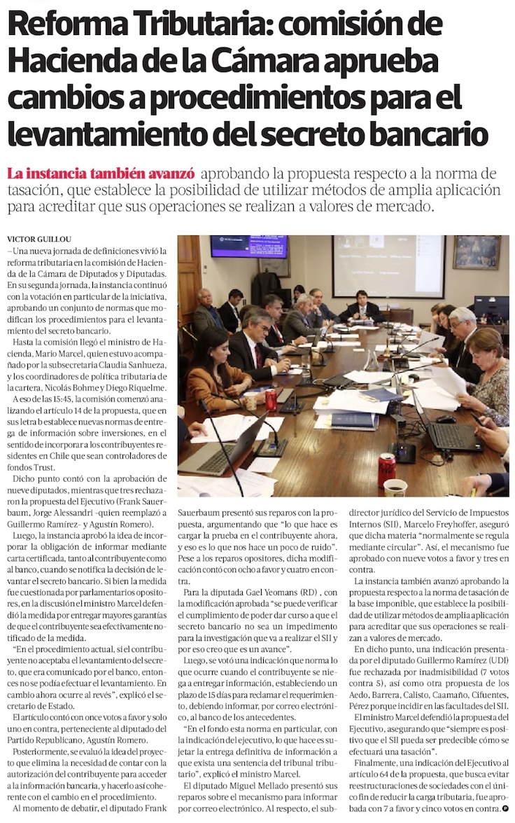 Reforma tributaria: comisión aprueba ajustes al secreto bancario y normas de valorización para evitar elusión - (Diario Financiero)