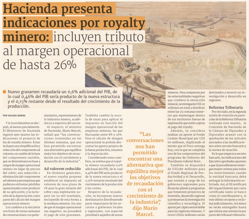 Hacienda presenta indicaciones al proyecto de royalty minero: Establece impuesto de tasa plana de 1% para grandes empresas - (emol)