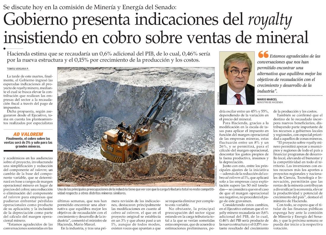 Hacienda presenta indicaciones por royalty minero: incluyen tributo al margen operacional hasta el 26% - (Diario Financiero)