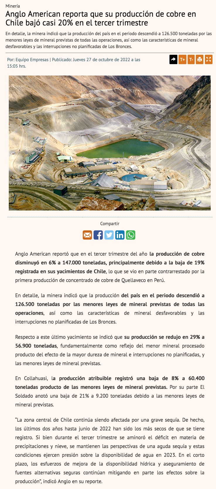 Producción de cobre de Anglo American en Chile bajó casi 20% en el tercer trimestre - (Diario Financiero)