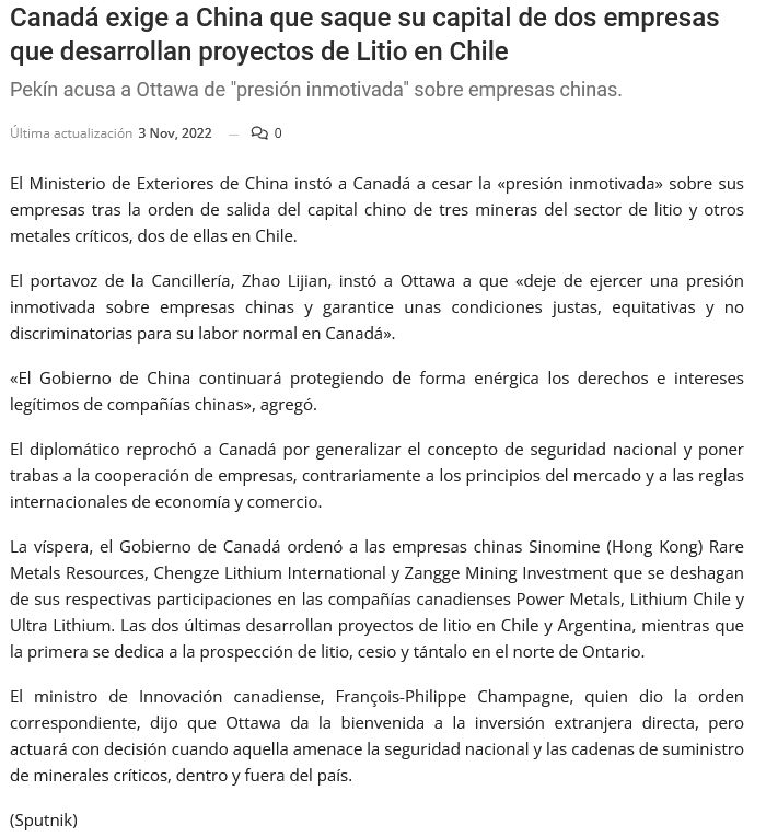 Canadá ordena a tres empresas chinas que abandonen inversiones en minerales críticos - (reporteminero)