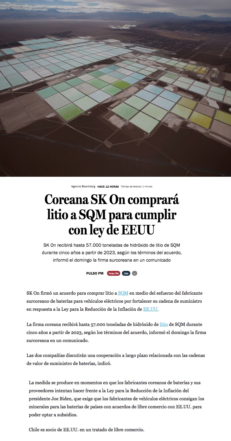 SQM suministrará litio a coreana SK y apuntan a más proyectos conjuntos - (El Mercurio de Santiago)