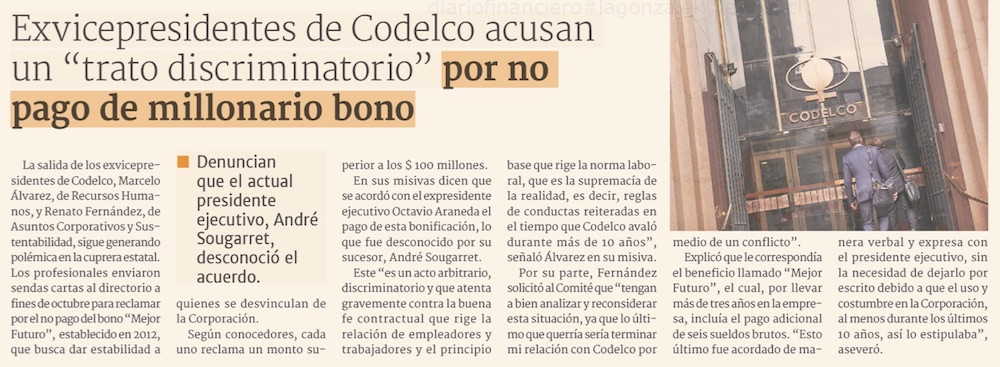 Exejecutivos se enfrentan con Codelco por indemnizaciones y acusan presiones para incorporar trabajadores - (El Mercurio de Santiago)