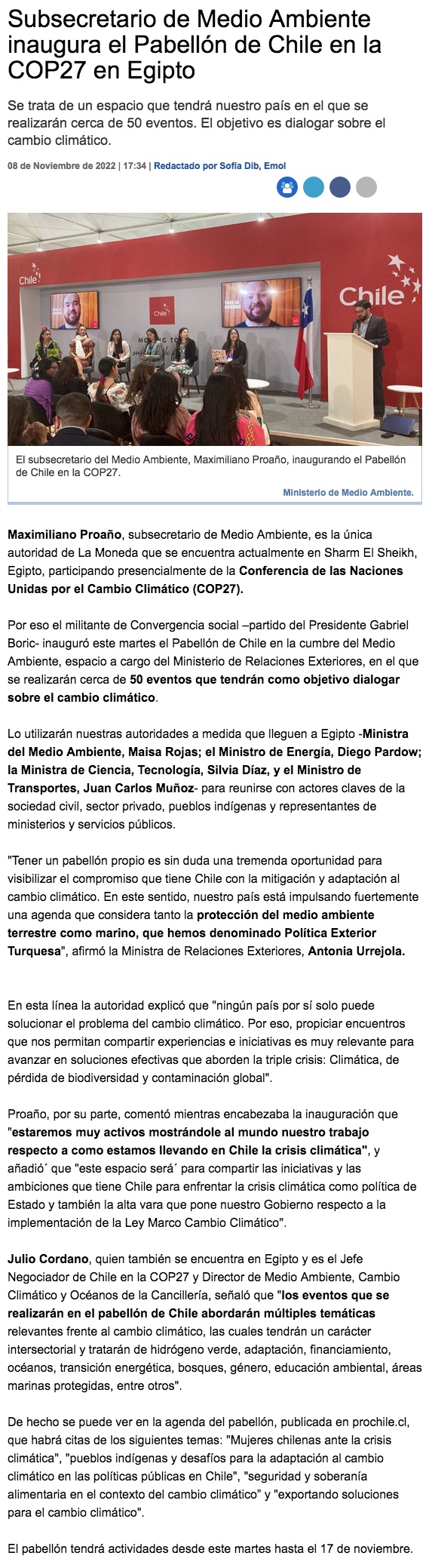 Chile inaugura su pabellón en la Cumbre del Clima COP27 en Egipto - (DF Online)
