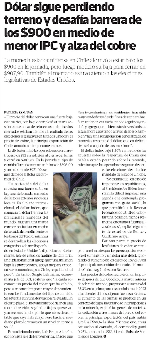Dólar cae más de $80 en dos semanas hasta los $900 en medio de elecciones en EE.UU. y cifras de IPC - (El Mercurio de Santiago)