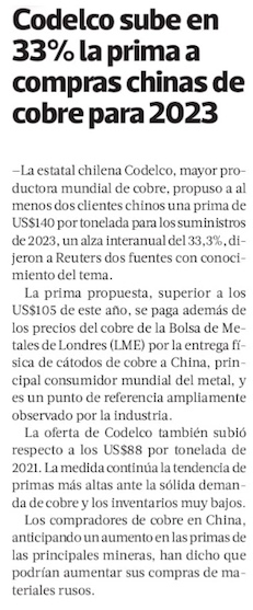 Chilena Codelco sube 33% prima sobre cobre a compradores chinos para 2023 - (americaeconomia online)