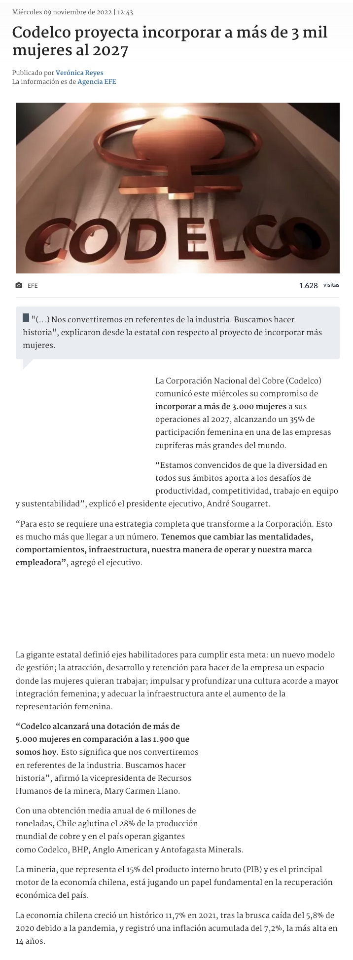 Codelco aspira a incorporar a más de 3.000 mujeres al 2027 - (Medios Regionales Cadena El Mercurio)