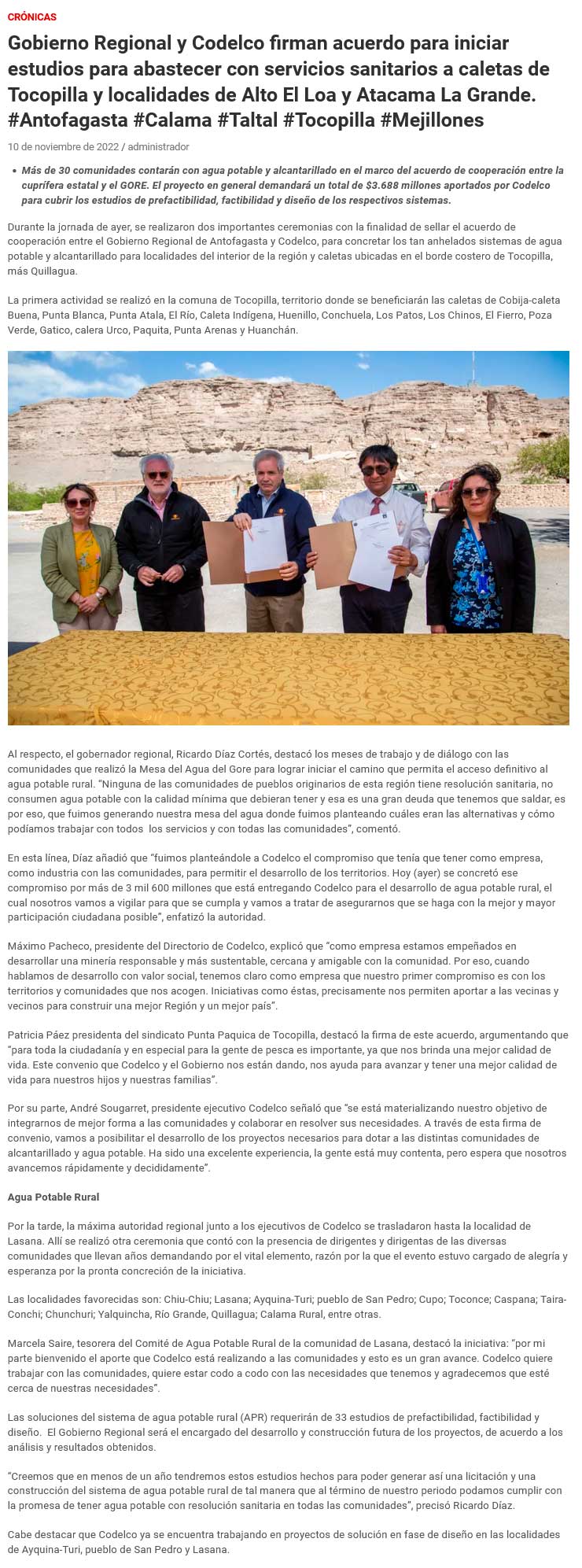 Destinan $3mil 688 millones para que 30 comunidades tengan agua potable - (El Mercurio de Calama)