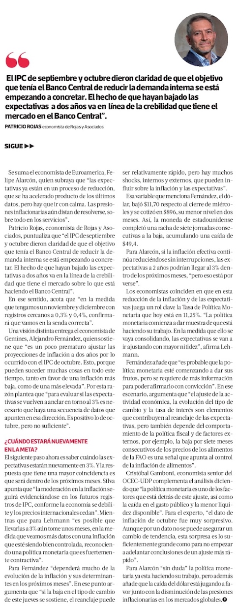 Expectativas de inflación a dos años plazo se moderan desde 3,9% a 3,5% y se acerca a meta del Banco Central - (El Mercurio de Santiago)