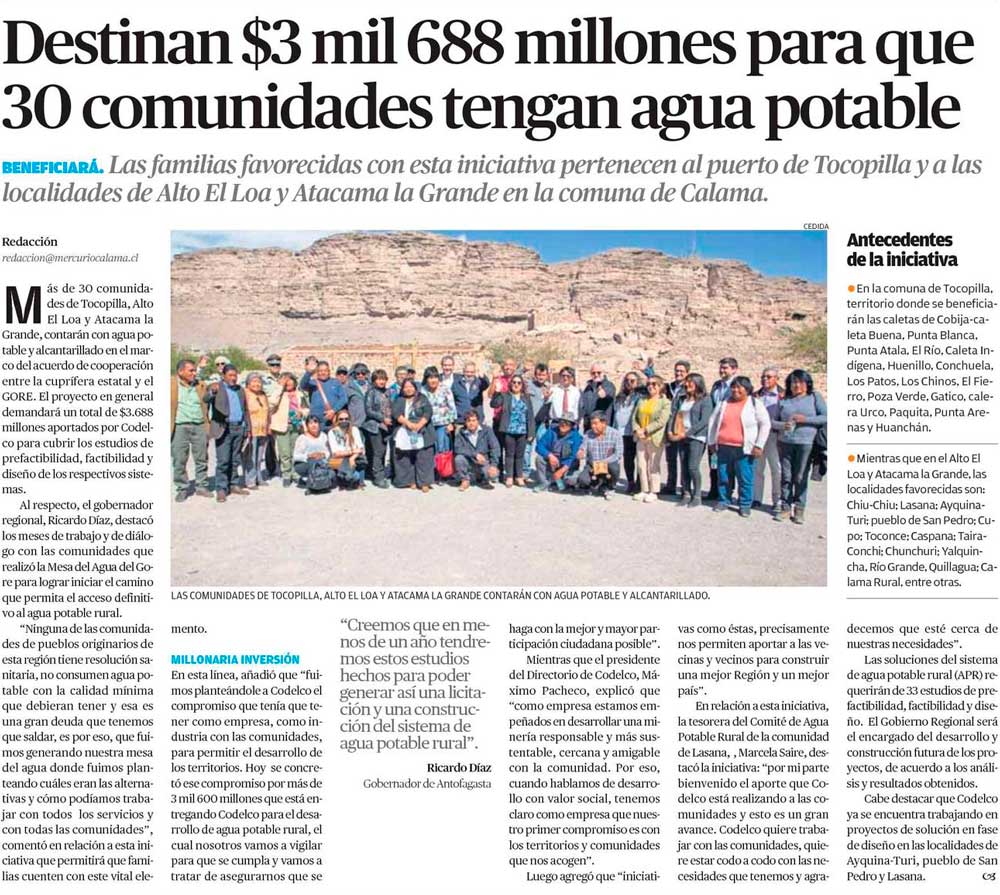 Gobierno Regional y Codelco firman acuerdo para iniciar estudios para abastecer con servicios sanitarios a caletas de Tocopilla y localidades de Alto El Loa y Atacama La Grande - (diarioangamos)