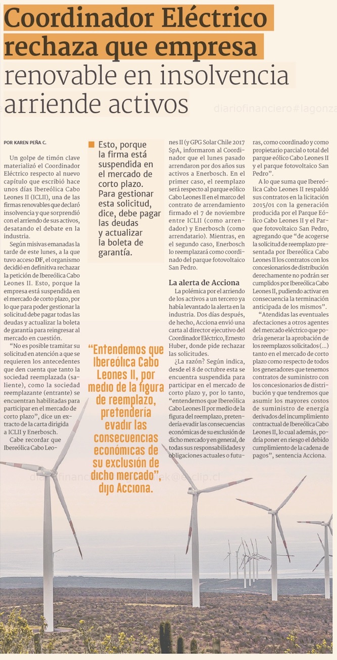 Coordinador rechaza solicitud para arrendar central de renovable en insolvencia - (El Mercurio de Santiago)