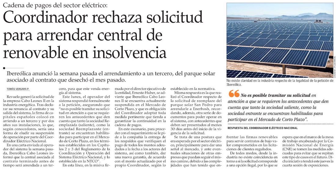 Coordinador Eléctrico rechaza que empresa renovable en insolvencia arriende activos - (Diario Financiero)