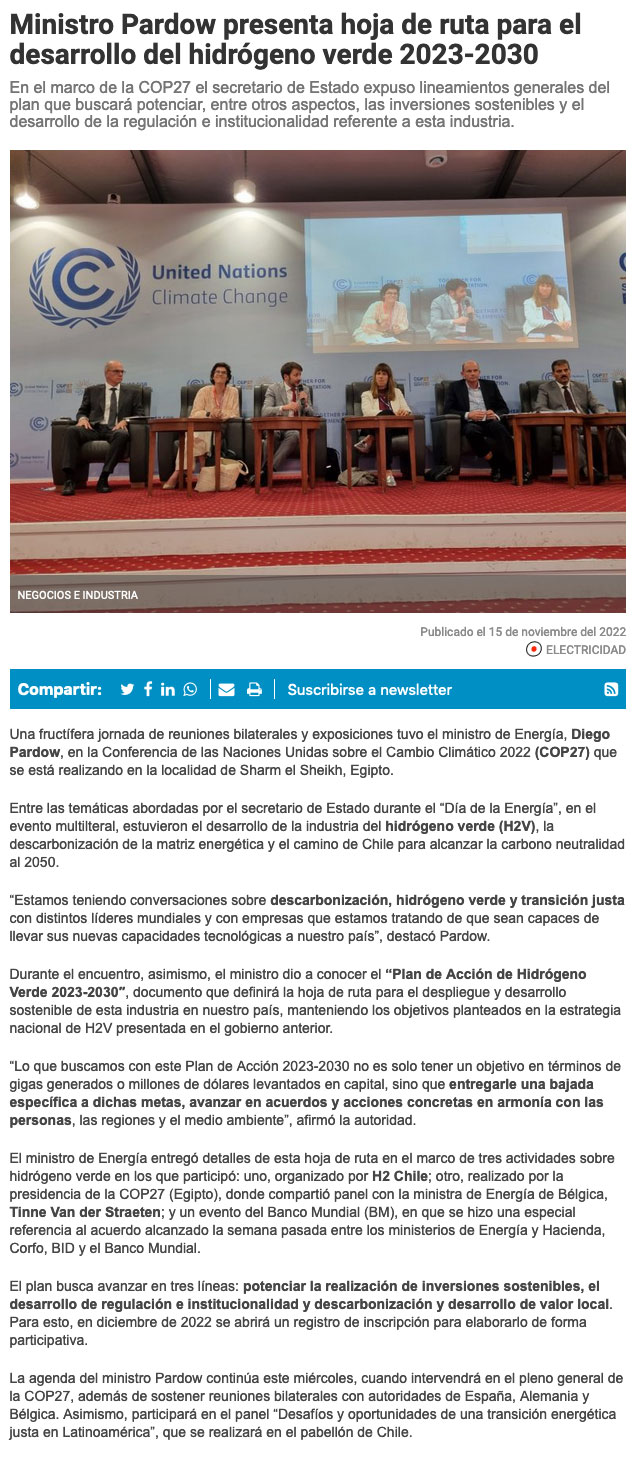 Chile en la COP 27 confirma hoja de ruta con el Hidrógeno Verde - (Radio Biobío)