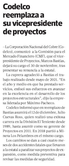 Cambios en Codelco: renuncia el vicepresidente de proyectos y asume exejecutivo de minera del grupo Luksic - (DF Online)