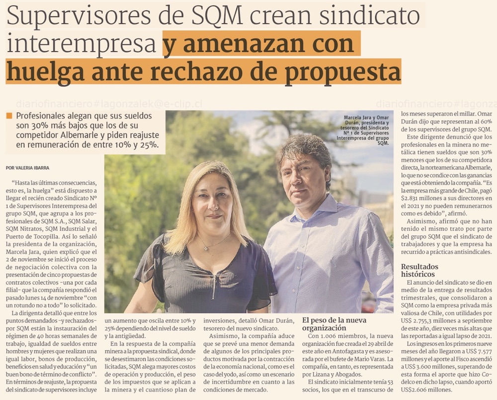 Supervisores de SQM crean nuevo sindicato y amenazan con huelga ante rechazo de propuestas - (DF Online)