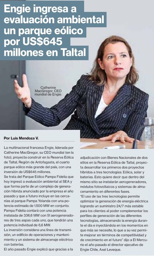 Ingresan proyecto eólico Pampa Fidelia de 645 millones de dólares de inversión - (El Mercurio de Antofagasta)