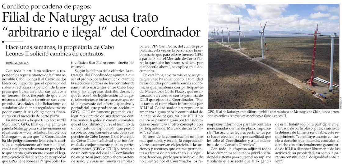 Firma renovable que declaró insolvencia arremete contra el Coordinador: “Se extralimita de las atribuciones que asigna el marco normativo” - (Diario Financiero)