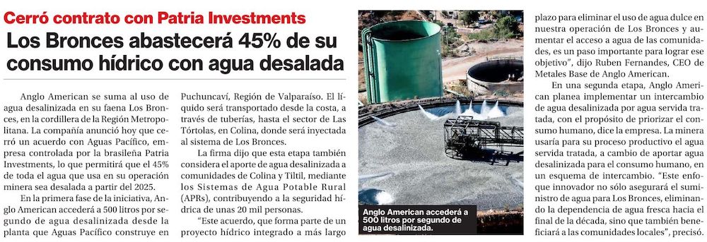 Anglo American cubrirá con agua desalada casi la mitad de suministro para mina Los Bronces en Chile en 2025 - (americaeconomia online)
