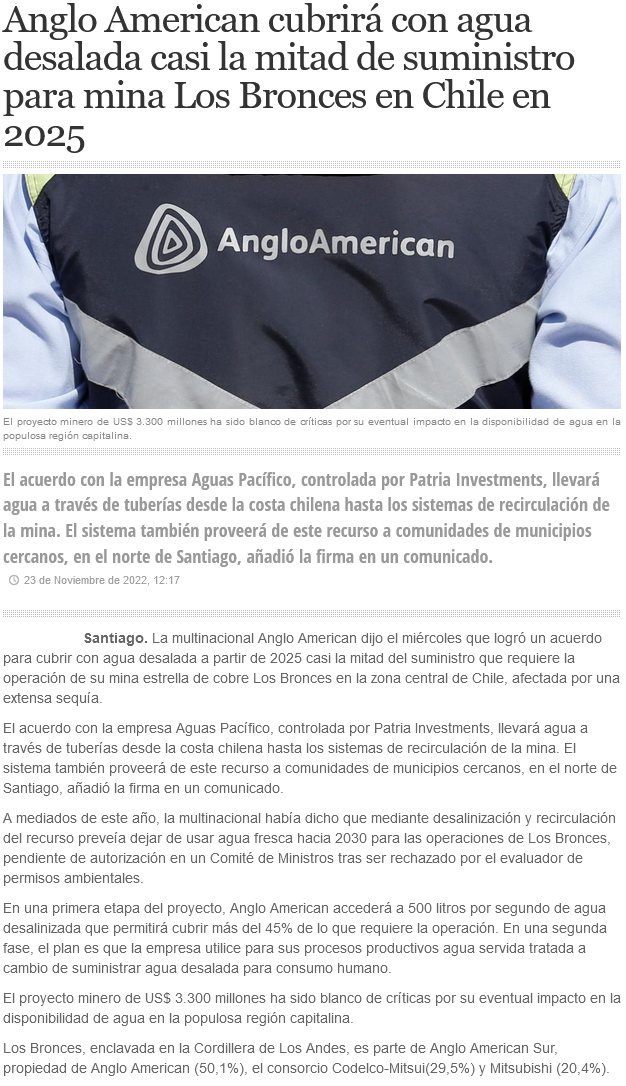 Anglo cierra contrato de agua desalada - (El Mercurio de Santiago)