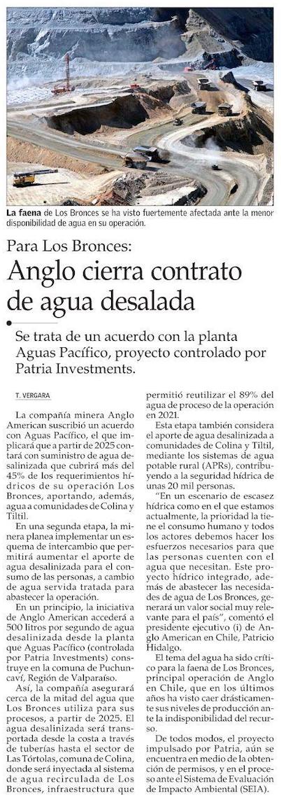 Anglo American cubrirá con agua desalada casi la mitad de suministro para mina Los Bronces en Chile en 2025 - (americaeconomia online)