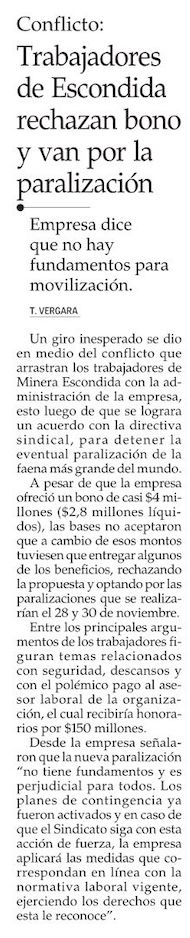 Sindicato N°1 rechaza la propuesta de la minera y reprograman posible paralización - (El Mercurio de Antofagasta)